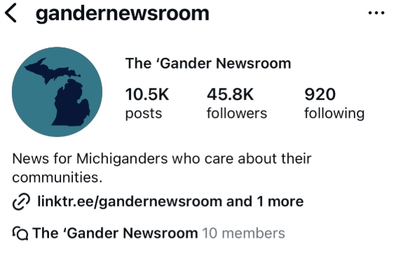 975. The ‘Gander Newsroom is an online news source for people who live in Michigan. You can find them on Instagram. I was extremely happy to come across them, thinking they were news about geese, or perhaps news reported by geese. I was wrong. @gandernewsroom